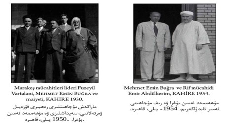 صورة (3) الصورة في اليمين: محمد أمين بوغرى مع الأمير عبد الكريم الخطابي قائد المجاهدين بالريف المغربي. والصورة في اليسار مع قائد مجاهدي مراكش الشيخ فضيل الورطلاني، عام 1950 بالقاهرة.